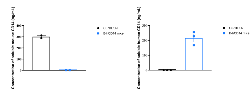 Soluble human CD14 expression analysis in homozygous humanized B-hCD14 mice by ELISA. Serum was collected from wild-type C57BL/6N mice andhomozygous B-hCD14 mice (female, 7-week-old, n=3). Expression level of soluble human CD14 and mouse CD14 were analyzed by ELISA (Mouse CD14 ELISA Kit,Proteintech, KE10113; Human CD14 ELISA Kit, Proteintech, KE00338). Soluble mouse CD14 was detectable only in wild-type mice. Soluble human CD14 wasdetectable only in homozygous B-hCD14 mice.