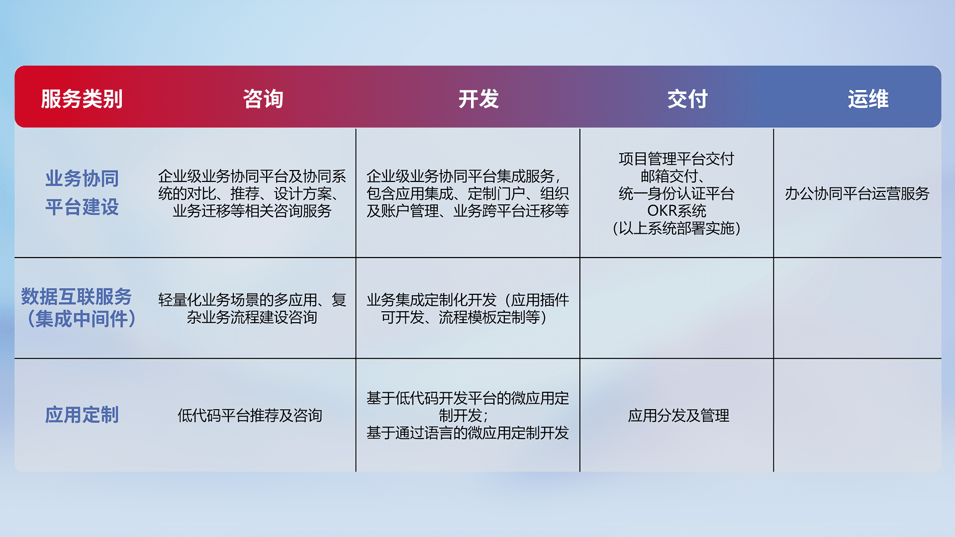 针对钉钉、、、、企微、、、、IDaas等平台级产品提供产品的规划、、、、方案、、、交付、、、定制化开发等服务,,,实现如统一协同办公、、、、智能客户服务、、混合会议管理、、智能数据查询、、等业务场景,,实现数字化转型。。